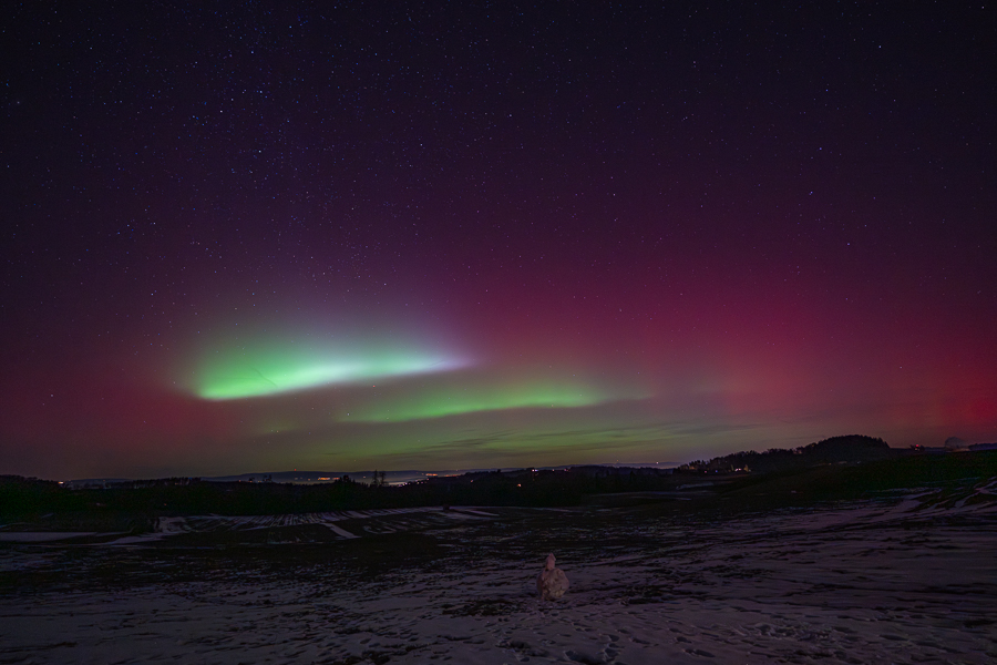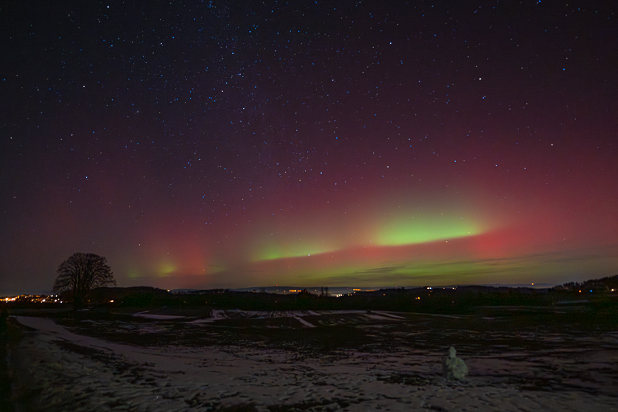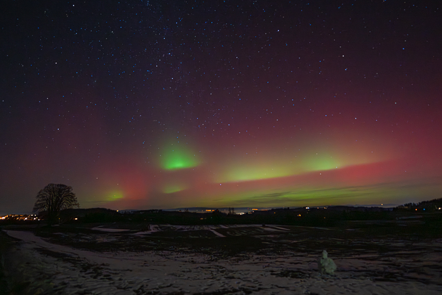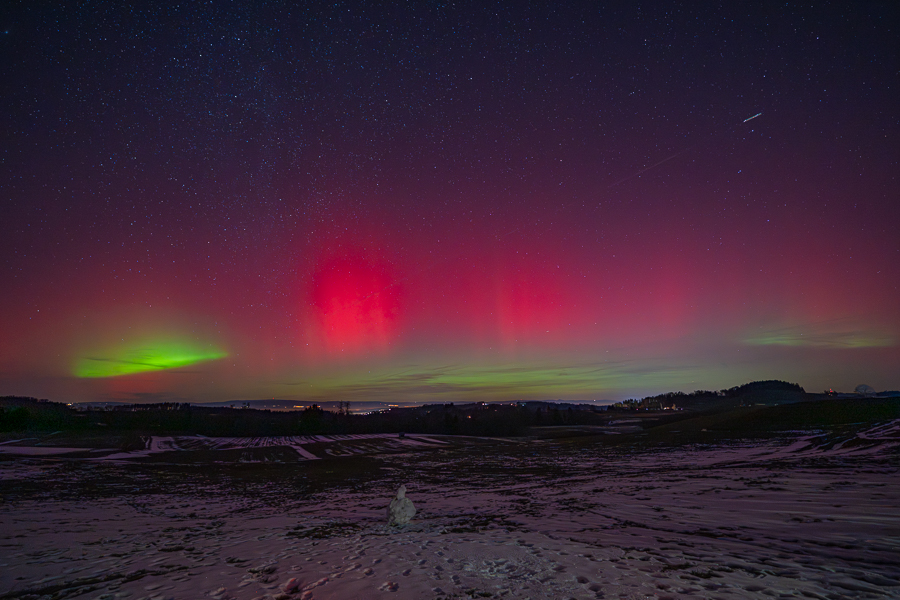Am 18. Januar las ich von einem grossen koronalen Massenauswurf, welcher eventuell die Erde in der Nacht vom 19. Januar erreichen würde. Ich setzte mir eine Erinnerung in den Kalender und machte die Fotoausrüstung bereit. Die Vorhersagen deuteten auf eine hohe Aktivität in den frühen Morgenstunden, aber es kamen immer mehr Alarme auf mein Handy und in den sozialen Medien wurden schon fantastische Bilder aus Island gepostet. So zog ich um 22 Uhr zu Fuss von Zuhause los und wurde schon nach wenigen Metern von rötlichem Himmel überrascht. Wie praktisch, wenn gleich am Dorfrand kaum Lichtverschmutzung herrscht. Der Naturpark Gantrisch ist bekannt für seinen „Dark Sky“, den dunklen Himmel und lag glücklicherweise über dem Nebel des Mittellandes. In den folgenden neunzig Minuten gab es ein tolles Schauspiel über dem Schneemann, den Kinder vor einiger Zeit gebaut hatten und nun einen tollen Vordergrund bot. Zwischendurch waren am vorwiegend roten Himmel grüne Flecken und Streifen zu sehen, welche teilweise stark aufleuchteten. Das waren für mich nach dem 10./11. Mai 2024 die zweiten starken Nordlichter in der Schweiz, am Neujahrsabend 2025 gab es schwächere mit der Kamera zu sehen. In den Medien war zu lesen, der Sonnensturm vom 19. Januar sei der stärkste seit 20 Jahren gewesen.