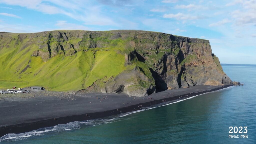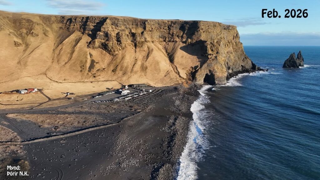 Ein Bildvergleich von Thorir Kjartansson von 2023, August 2024 und Februar 2026 zeigt das Ausmass der jetzigen Erosion. Thorir stammt aus Vik, ist ein begnadeter Fotograf und kennt die Natur in der Region wie wohl kaum ein anderer. Vielen Dank, dass ich die Drohnenfotos hier veröffentlichen darf.