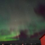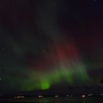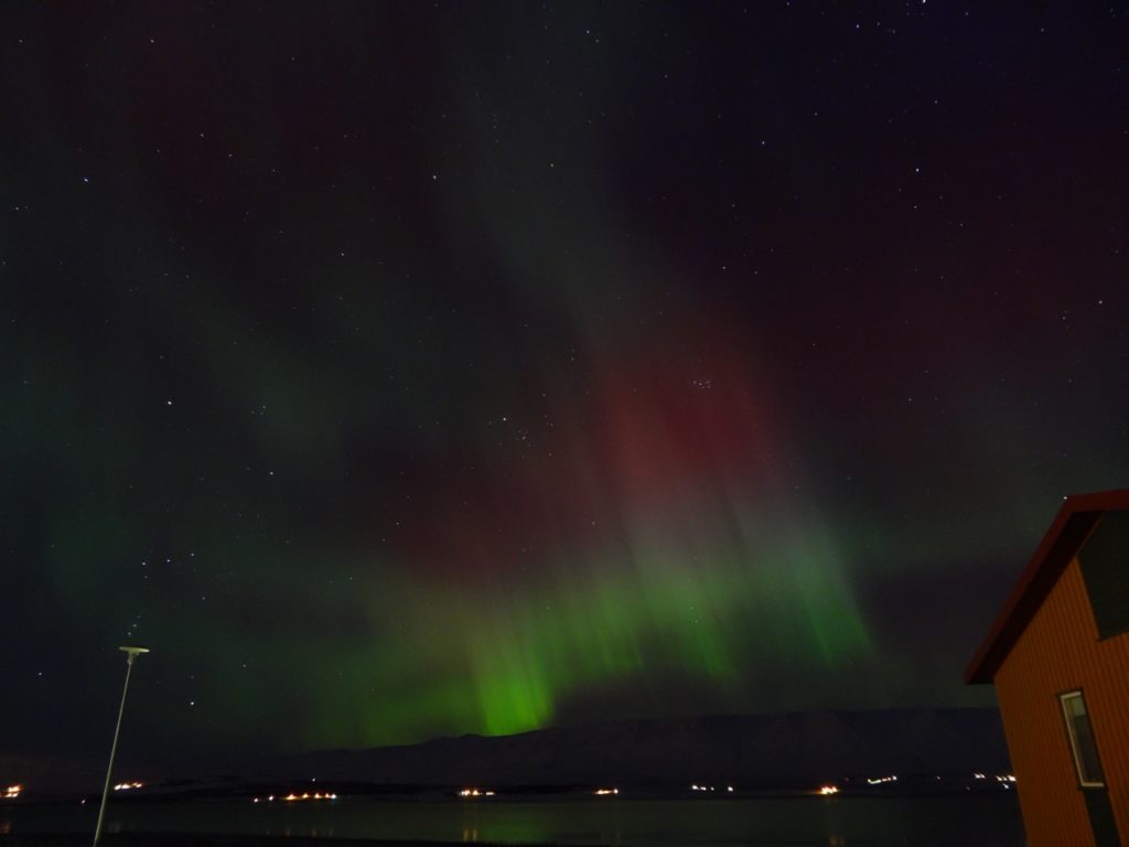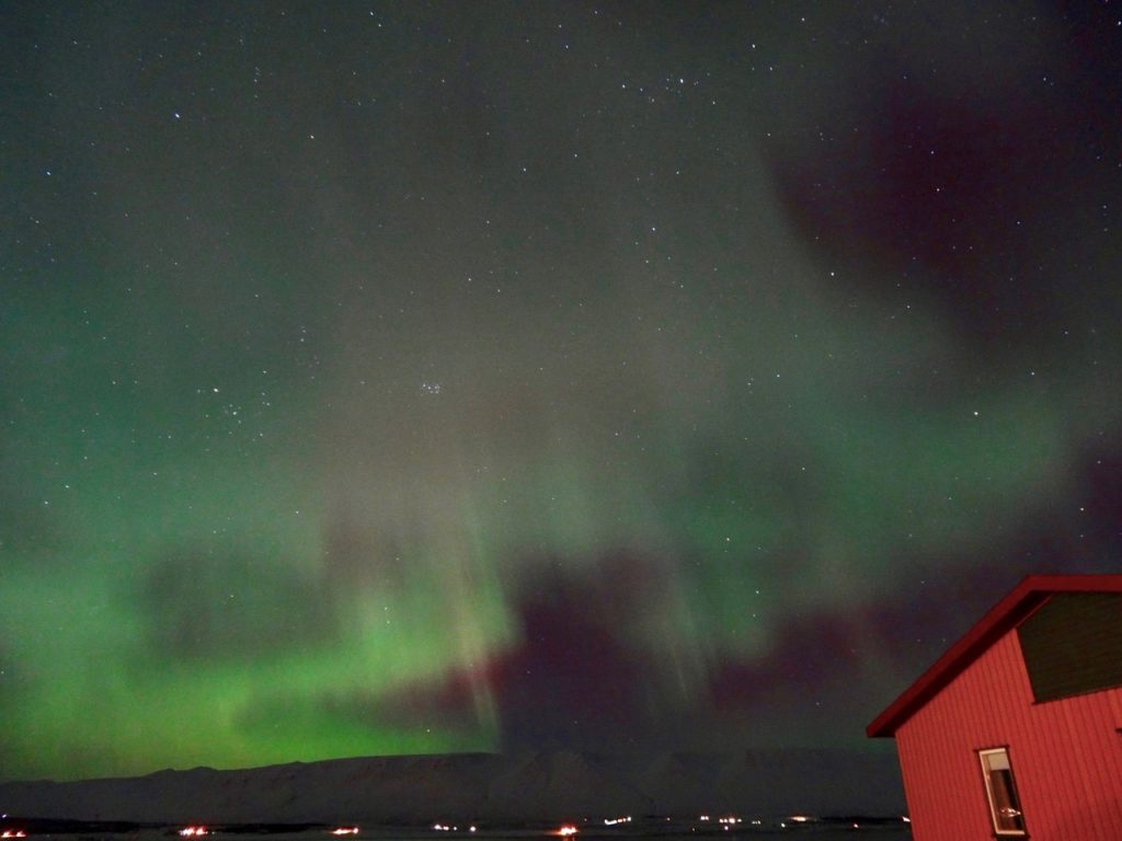 - Das Nordlicht über dem Eyjafjördur zeigt sich auch in rot. Bild von Hotel Natur, 6 Uhr morgens, 09.11.2013